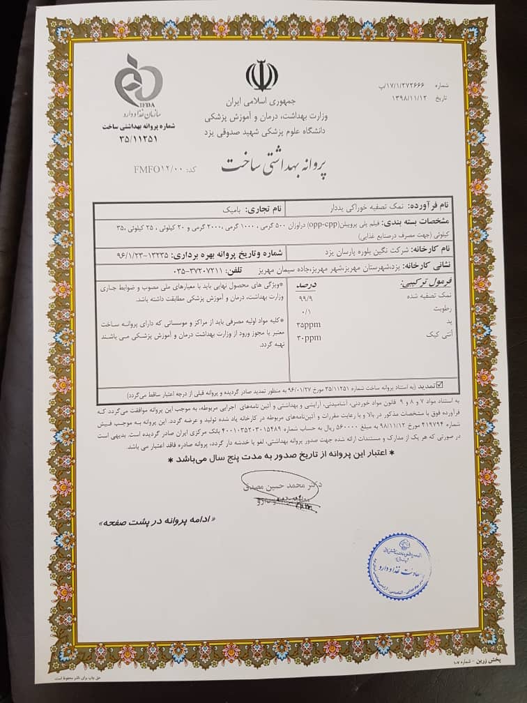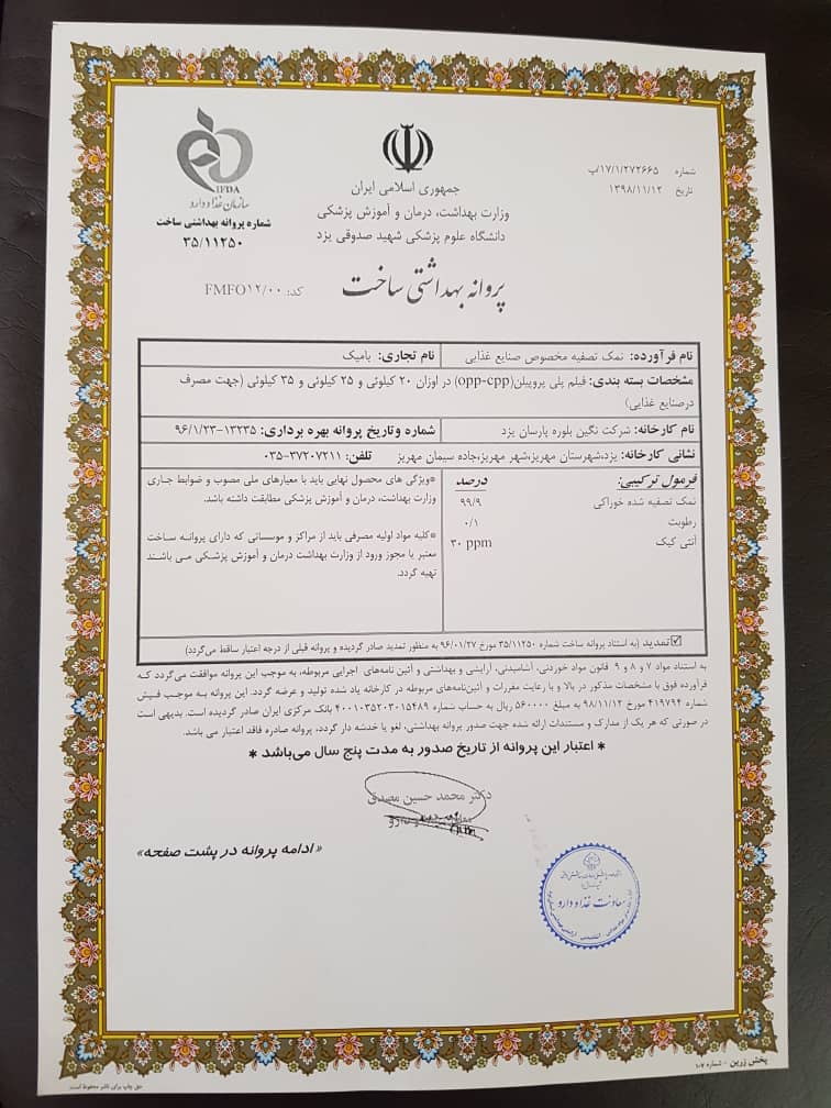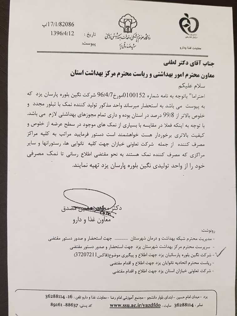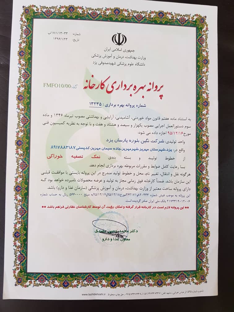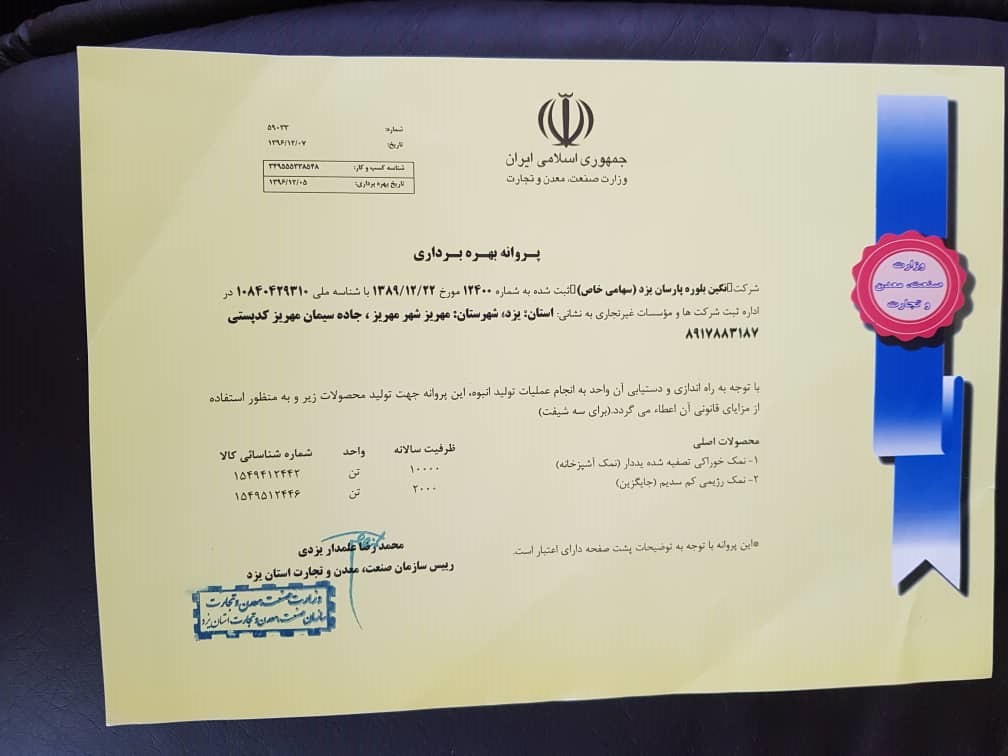 شرکت نگین بلوره پارسان یزد یکی از شرکتهایی است که در این راستا یعنی اشتغال پایدار از طریق تولید محصولاتی که هم نیاز مردم را برطرف نماید و هم در جهت سالم سازی تغذیه و فرهنگ سلامت آنها شروع به کار نموده است.لذا از سال 1389 خورشیدی با تحقیقات و تلاش زیاد با توجه به نیاز جامعه و عدم اطلاع مردم از نمک مصرفی غیر بهداشتی در جهت تولید محصولی که از هر جهت نیاز جامعه در بخش مصرف مردم و هم در بخش صنعت در حوزه های متعدد گام برداشته است که این تلاش به صورت عملیاتی از سال 94 شروع و در اواخر سال 95 در زمینی به مساحت 15000 متر مربع به بهره برداری رسید. از نظر تجهیزات انتخابی تولید بهترین انتخاب صورت گرفته است. این خط تولید نمک اصالتا از شرکت یو اس فیلتر آمریکا بوده که بهینه شده و به روز ترین خط می باشد. به عنوان مثال از لحاظ مصرف انرژی و هم از لحاظ مصرف آب در پایین ترین حد قرار دارد در حالیکه محصول در بهترین کیفیت و با خلوص 99/8 تولید می شود.